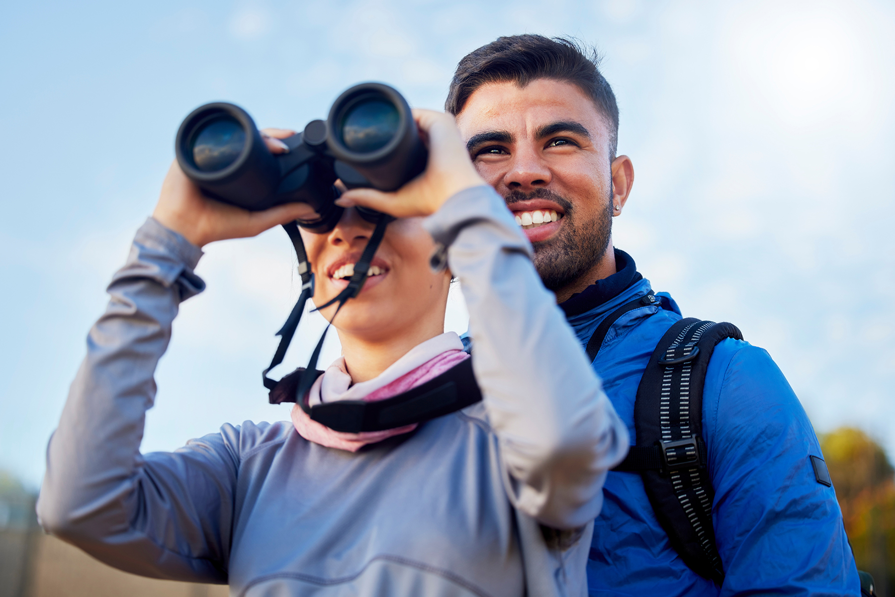 Nature, binoculars and couple hiking together for fitness, exercise and fresh air on an adventure t.