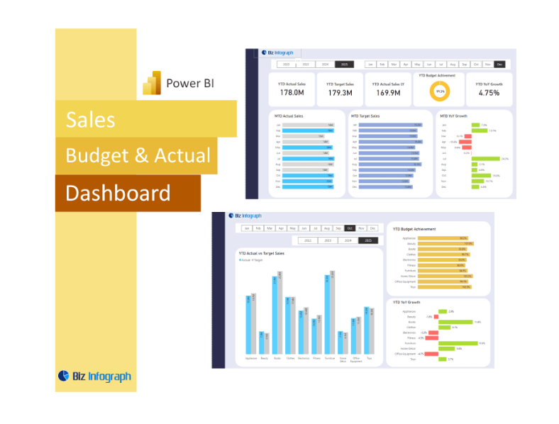 Sales budgets play a role; however, without comparing them to actual results their effectiveness diminishes. By utilizing a Sales Budget compared to dashboard created in Power BI raw data is transformed into insights that support accountability, efficiency enhancement and business expansion initiatives. Bizinfograph offers ready-to-use dashboard templates on Finance, Sales, HR and Manufacturing.
